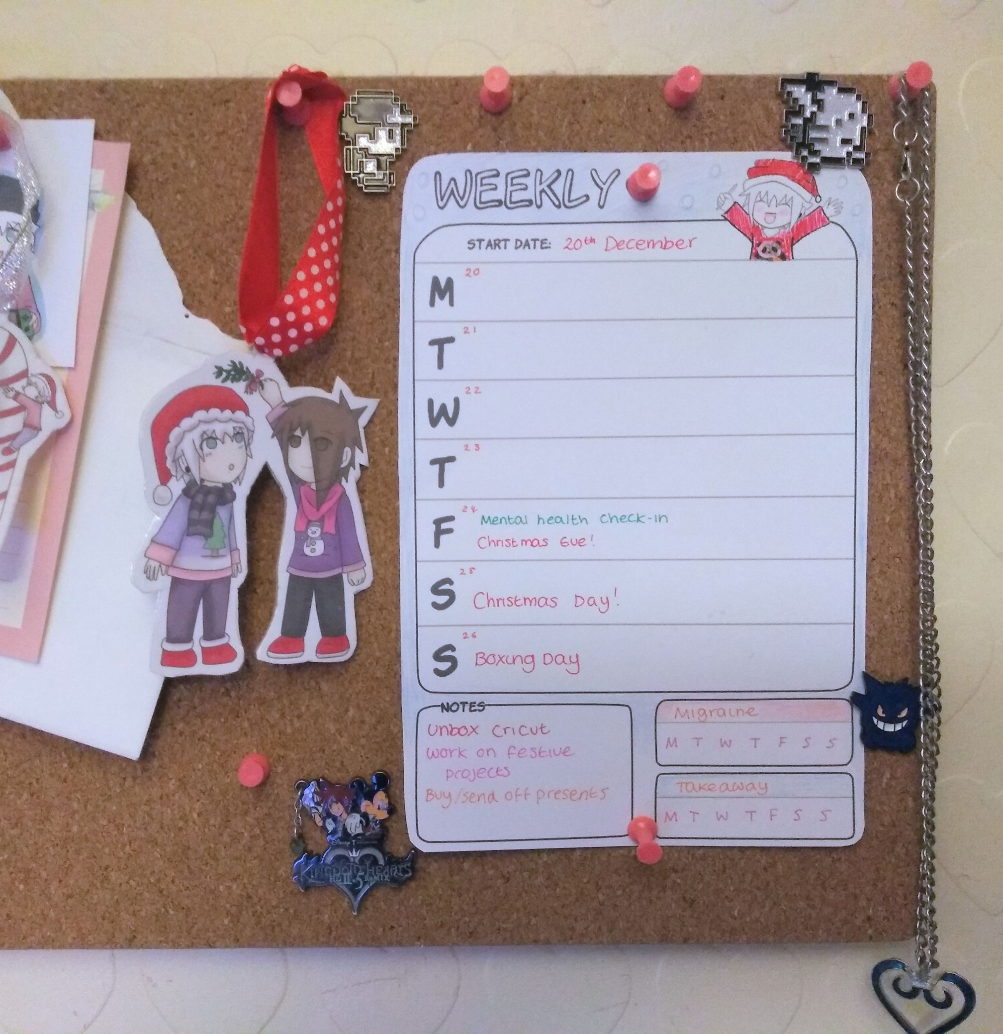 I tried keeping trackers in my diary, but I don’t always have the motivation to open it (especially on a bad mental health day), it’s just so much more handy to have everything set up on a wall :3